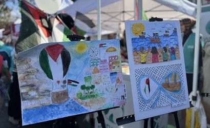 Sağban, "Filistin ve Gazze soykırımına ilişkin düzenlediğimiz resim yarışmasına katılan çocukların eserlerinden seçtiklerimizi bugün burada sergiliyoruz." dedi. Jürinin seçtiği eserler daha sonra düzenlenecek müzayedede açık artırmayla bağış karşılığında satılacak.