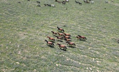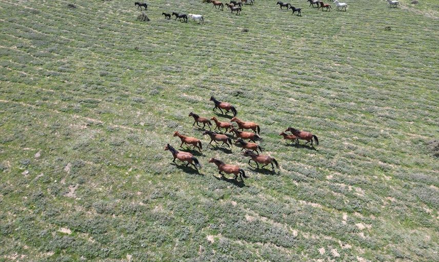 Afyonkarahisar'ın Emirdağ ilçesindeki yılkı atları, doğal yaşam alanlarında havadan görüntülendi.