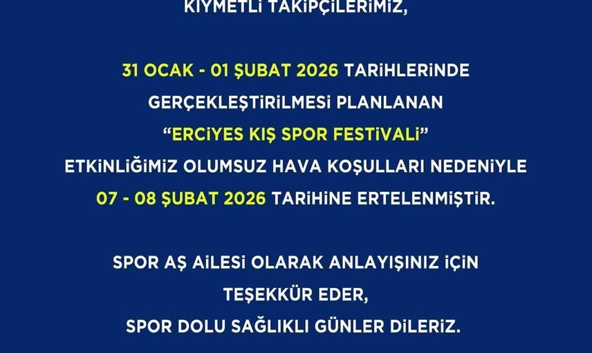Kayseri Büyükşehir Belediyesi Spor A.Ş. tarafından yapılan paylaşımda, 31 Ocak - 01 Şubat 2026 tarihlerinde gerçekleştirilmesi planlanan "Erciyes Kış Spor Festivali" etkinliğimiz olumsuz hava şartları nedeniyle 07-08 şubat 2026 tarihine ertelenmiştir. Spor A.Ş. ailesi olarak anlayışınız için teşekkür eder, spor dolu sağlıklı günler dileriz