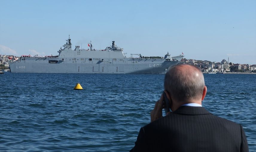 Çalışma ofisinin açık alanında gemileri izleyen Erdoğan, mürettebata ve törende olan vatandaşlara el salladı. Selamlaşma anında TCG Anadolu gemisinde bulunan Deniz Kuvvetleri Komutanı Oramiral Ercüment Tatlıoğlu ile telefon görüşmesi gerçekleştirdi; Erdoğan, "Savunma Bakanım, bütün Kuvvet Komutanlarım, hep birlikte şu anda sizleri selamlıyoruz." dedi.