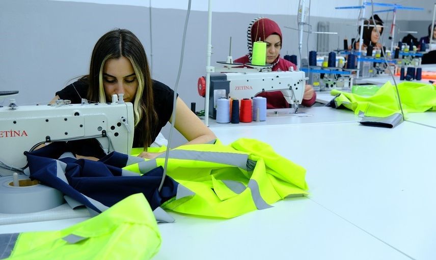 Belediyenin Zabıta, İtfaiye, Temizlik İşleri, Fen İşleri, Park ve Bahçeler, Su ve Kanalizasyon ile Güvenlik ve Destek Hizmetleri müdürlüklerinde görev yapan personelin iş kıyafetleri — pantolon, tişört, mont, yelek, ikaz yeleği ve benzeri ürünler — bu atölyede dikiliyor.