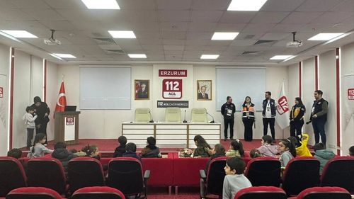 Erzurum'da Tatbikat İlkokulu öğrencileri, 'Acil Durumda Tek Numara112' bilincini artırmak için 112 Acil Çağrı Merkezi'ni ziyaret etti.