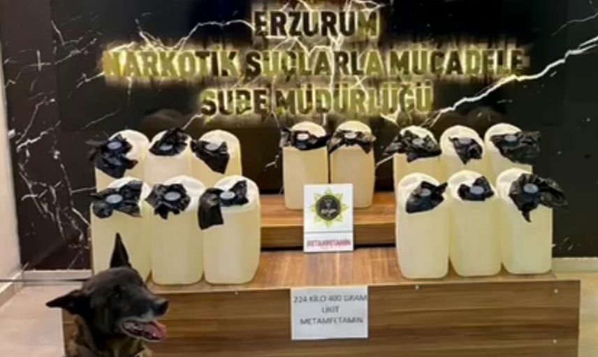 Erzurum’da polis ekiplerinin yürüttüğü operasyonda, piyasaya sürülmek üzere hazırlanan 224 kilo 400 gram likit metamfetamin ele geçirildi. Yakalanan uyuşturucunun piyasa değerinin yaklaşık 336 milyon TL olduğu bildirildi.