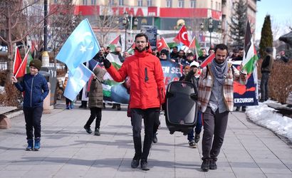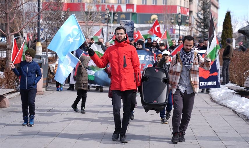 Kent merkezinde bulunan Lalapaşa Camisi'nin önünde toplanan doktorlar, tıp fakültesi öğrencileri ile sağlık çalışanları, Türk, Filistin ve Doğu Türkistan bayraklarını taşıyarak döviz ve pankartlarla Yakutiye Medresesi'ne kadar yürüdü.