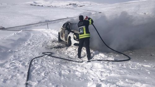 Erzurum'un Horasan ilçesinde seyir halindeki otomobil, yangın sonucu kullanılamaz hale geldi. İtfaiye ekipleri yangını kontrol altına aldı.