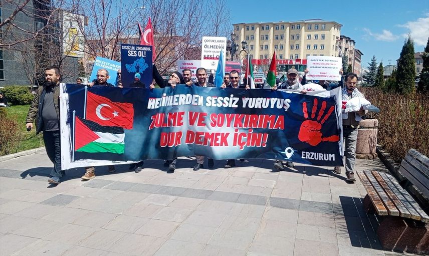 Erzurum'da hekimler ve sağlık çalışanları, İsrail'in Gazze'ye yönelik saldırılarını protesto etmek amacıyla 76. haftada da sessiz yürüyüşlerini sürdürdü.