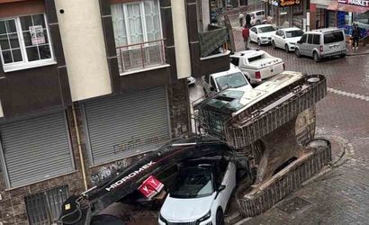 Devrilen iş makinesinin kepçesi, park halindeki iki otomobil ve bir motosikletin üzerine düştü. Şans eseri olayda ölüm ya da yaralanma olmadı.
