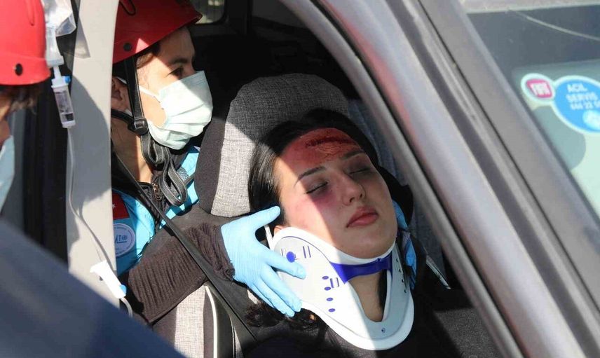 Senaryo gereği kafa kafaya çarpışmış iki araçtaki yaralılara ekipler anında müdahale etti. Polis güvenlik önlemlerini alırken, itfaiye çıkan yangını söndürdü; AFAD ve itfaiye ekipleri araçta sıkışanlara alan açtı. Ardından UMKE ve İl Ambulans Servisi ekipleri tarafından çıkarılan ve ilk müdahalesi yapılan yaralılar ambulanslarla hastanelere sevkil edildi.