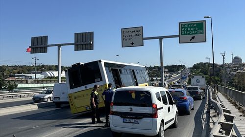 Fatih'te seyir halindeki İETT otobüsü, çarpışmanın ardından çelik bariyerlere asılı kaldı. Olay yerinde trafik yoğunluğu oluştu.
