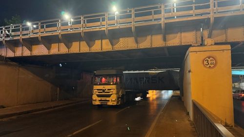 Fatih'te bir tırın dorsesindeki konteyner alt geçide takılarak yolun ulaşıma kapanmasına neden oldu.