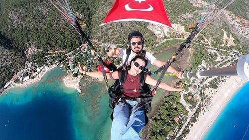 Fethiye'de 19 Mayıs Bayramı'nda 22 üniversite öğrencisi Türk bayraklarıyla yamaç paraşütü yaptı.