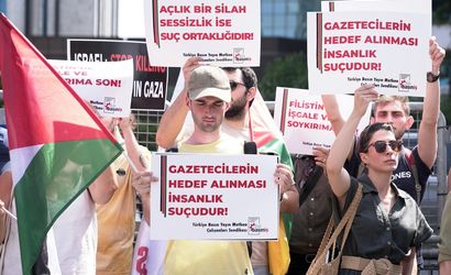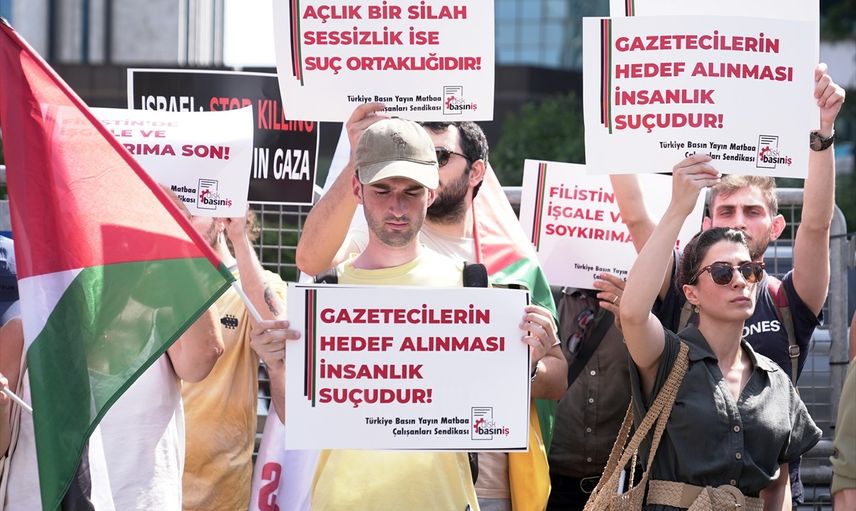 İsrail'in İstanbul Başkonsolosluğu önünde bir araya gelen basın meslek örgütlerinin üyeleri, İsrail'in Filistin'de görev yapan gazetecilere yönelik hak ihlallerini protesto etti. Türkiye Gazeteciler Cemiyeti, Sınır Tanımayan Gazeteciler, Türkiye Gazeteciler Sendikası ve DİSK Basın-İş'e üye bir grup basın mensubu, Gazze'de gazetecilerin karşı karşıya bulunduğu duruma tepki göstermek amacıyla Levent'teki başkonsolosluk önünde toplandı. Sınır Tanımayan Gazeteciler Türkiye Temsilcisi Erol Önderoğlu, grup adına hazırlanan basın açıklamasını okudu.