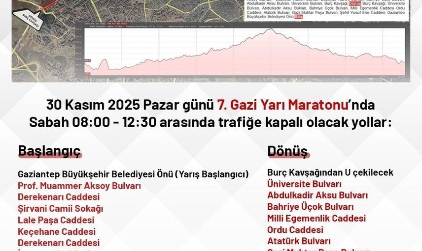 Gaziantep Büyükşehir Belediyesi tarafından bu yıl 7’ncisi düzenlenecek Gazi Yarı Maratonu kapsamında, 30 Kasım 2025 Pazar günü saat 08.00-12.30 arasında kent merkezinde bazı yollar trafike kapatılacak.