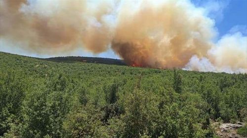 Gaziantep'in Nurdağı ilçesinde çıkan orman yangınına, havadan ve karadan müdahale ediliyor.