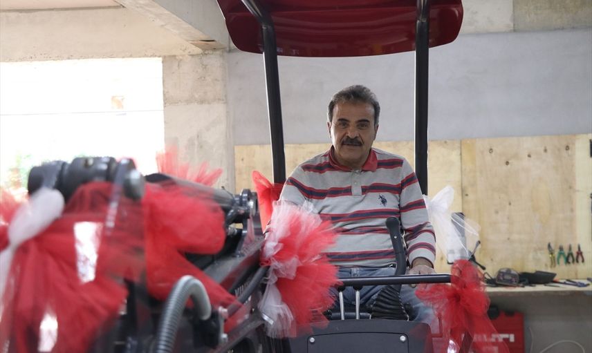 Gaziantep'te faaliyet gösteren düğün salonunun işletmecisi Gazi Albayrak (sol), yanında çalışan ve ülkesine dönmeye karar veren Suriyeli işçisi Muhammed Aliy'e (sağ) mini ekskavatör hediye etti.