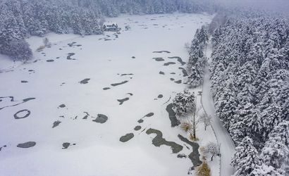 Bolu'nun doğal güzellikleriyle ünlü Gölcük Tabiat Parkı, kar yağışının ardından beyaza büründü. Tabiat parkındaki gölün donmuş yüzeyi ve çevresinde oluşan kar manzarası, dronla görüntülendi.