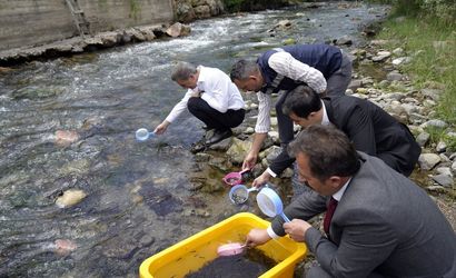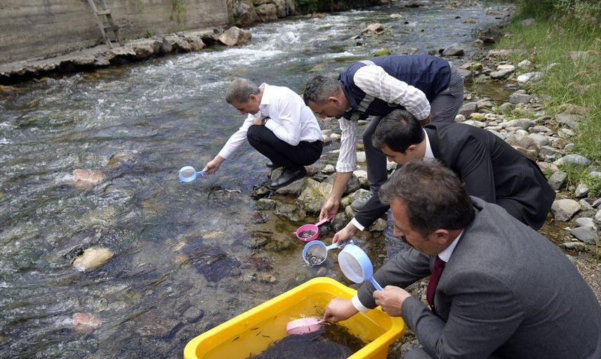 Gümüşhane'nin Torul ilçesindeki Çit Deresi'ne 10 bin kırmızı benekli alabalık yavrusu bırakıldı. Vali Aydın Baruş (sağ 2), etkinliğe katıldı.