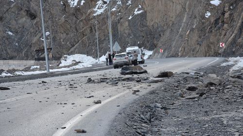 Hakkari'de bir dağdan kopan kaya, seyir halindeki Irak plakalı otomobile çarptı. Yaralanan olmadı, yol kısa sürede açıldı.