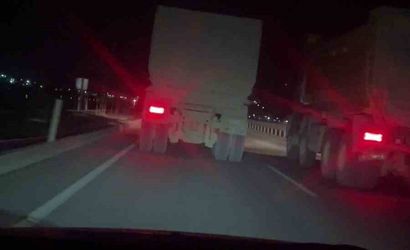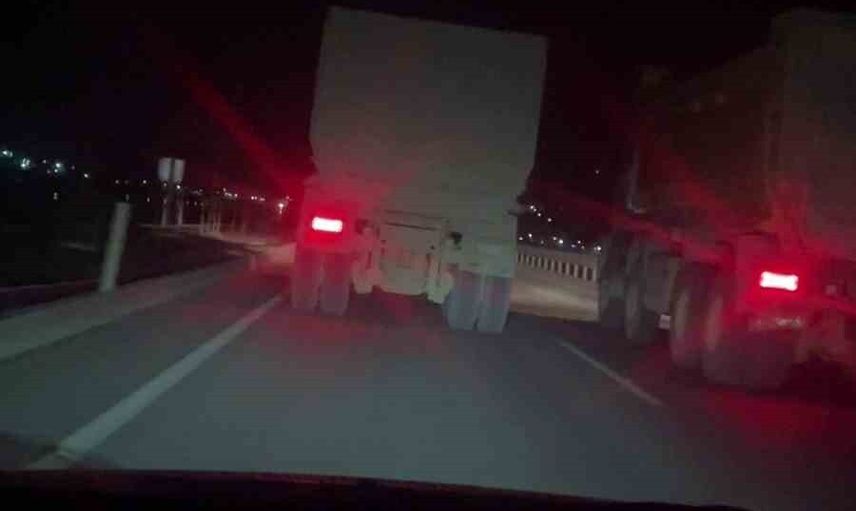 Olay, Antakya ilçesi havaalanı yolunda gerçekleşti. Arkalarından seyreden ve hızları 100 kilometreyi bulan kamyonların o anları anbean görüntülendi.