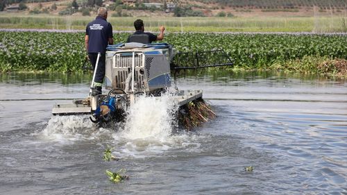 Hatay'ın Kırıkhan ilçesindeki Gölbaşı Gölü, belediye ekipleri tarafından temizleniyor. Su sümbülleri ile mücadele sürüyor.