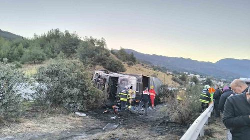Hatay'da devrilen 63 ADM 974 plakalı tır alev alarak iki kişinin ölümüne yol açtı; araçtan kaçan anguslar otobana yayılarak kazalara neden oldu.