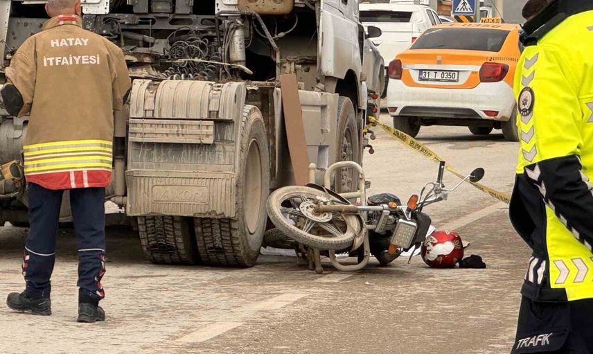 Hatay’ın Antakya-İskenderun yolu Dericiler kavşağında meydana gelen kazada, 31 MD 1357 plakalı motosiklet ile 31 AKR 883 plakalı tır çarpıştı.