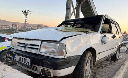 Hatay’da meydana gelen kazada, trafikte seyreden Tofaş marka 31 AVB 084 plakalı otomobil, Defne ilçesi Çekmece Mahallesi yakınlarında üst geçidin merdivenine çarparak takla attı.