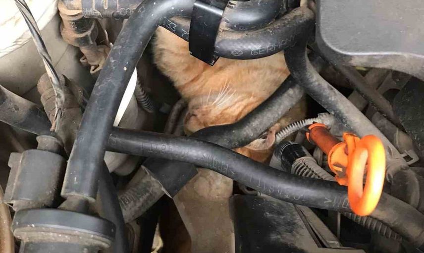 Hatay'da gece saatlerinde hava sıcaklığının 5 dereceye kadar düşmesi sonucu üşüyen bir yavru kedi, Reyhanlı ilçesi Oğulpınar Mahallesi'nde park halindeki bir otomobilin motor kısmına girdi.
