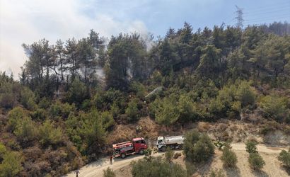 Hatay'ın merkez Antakya ilçesinde, Karaali Mahallesi'nde dün çıkan orman yangını söndürme çalışmaları havadan görüntülendi. Şiddetli rüzgarın etkisiyle yangın hızla Oğlakören, Üçgedik ve Alazi mahallelerine sıçradı ve yangınla mücadele durumda olan dört mahallede ekiplerin müdahalesi devam ediyor.