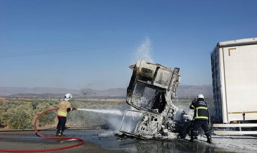 Yangında, sürücüsünün kimliği ve plakası henüz öğrenilemeyen tır kullanılamaz hale geldi.