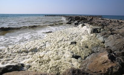 Hatay'ın Arsuz ilçesinde, deniz kıyısındaki bazı bölgelerde köpük benzeri tabaka oluştu.