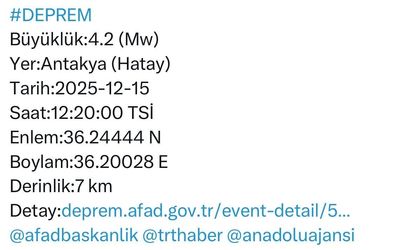 AFAD verilerine göre saat 12.20 sıralarında Hatay’ın Antakya ilçesinde, 7 kilometre derinlikte 4.2 büyüklüğünde deprem meydana geldi. Depremi hisseden vatandaşlar tedirginlik yaşadı; ancak ilk belirlemelere göre herhangi bir yıkım olmadığı öğrenildi.