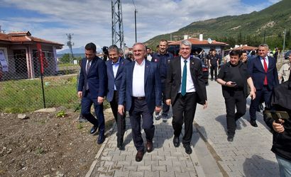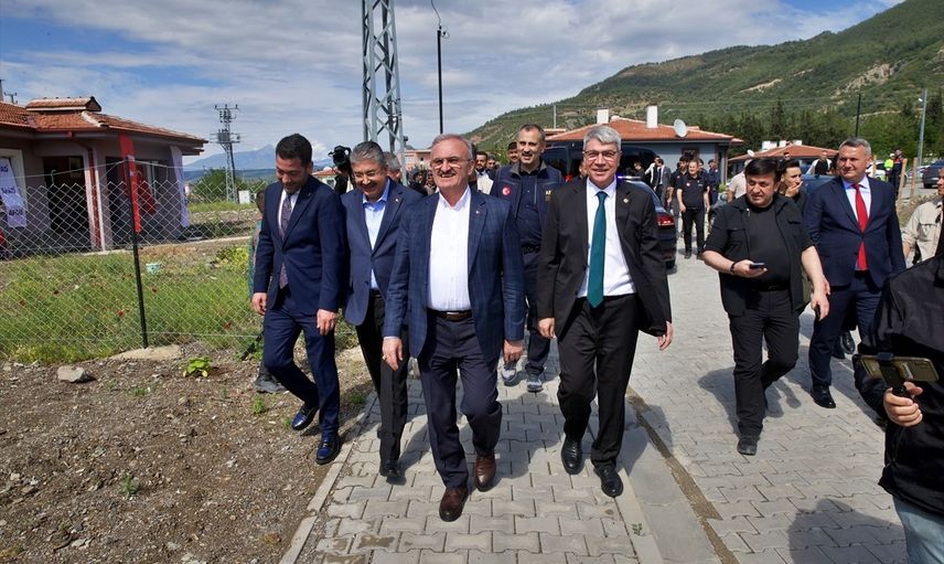 İçişleri Bakan Yardımcısı Münir Karaloğlu (sağ 5), Osmaniye'nin merkeze bağlı Issızca köyüne yaptırılan köy evlerinde incelemelerde bulundu, burada TOKİ tarafından inşa edilen evine yerleşen bir aileyi ziyaret etti.