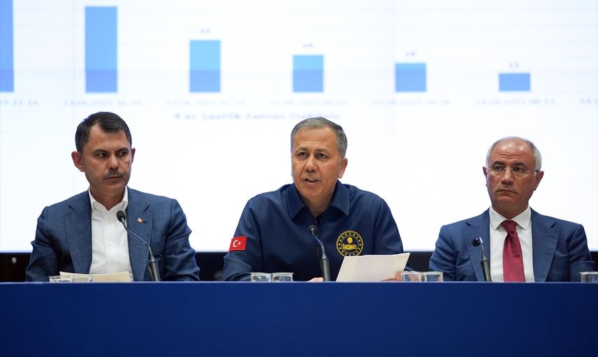 İçişleri Bakanı Ali Yerlikaya (ortada), Hasdal'daki İstanbul İl Afet ve Acil Durum Müdürlüğünde kurulan kriz merkezindeki değerlendirme toplantısının ardından gazetecilere açıklama yaptı. Toplantıya Çevre, Şehircilik ve İklim Değişikliği Bakanı Murat Kurum (solda) ile AK Parti Genel Başkanvekili Efkan Ala (sağda) katıldı.
