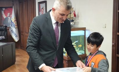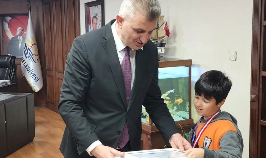 GÖLCÜK BELEDİYE BAŞKANI ALİ YILDIRIM SEZER, ULUSAL VE ULUSLARARASI MATEMATİK OLİMPİYATLARINDA 3 ALTIN MADALYA KAZANAN İLKOKUL ÖĞRENCİSİ SARP AREL GÜVENÇ'İ AĞIRLADI.