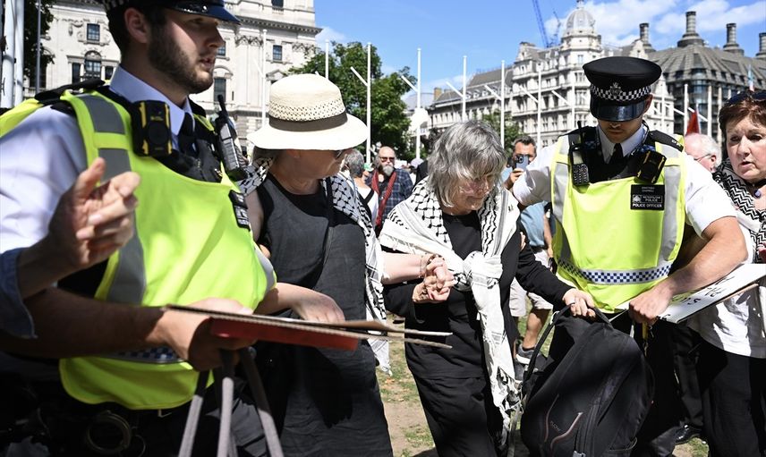 İngiltere'de yasaklı örgüt ilan edilen "Palestine Action" grubuna destek amacıyla, başkent Londra’daki Parlamento Meydanı’nda eylem düzenledi. Gösteri öncesinde polis bölgede yoğun güvenlik önlemleri aldı. Eylem başlamadan önce bir kişi gözaltına alındı.