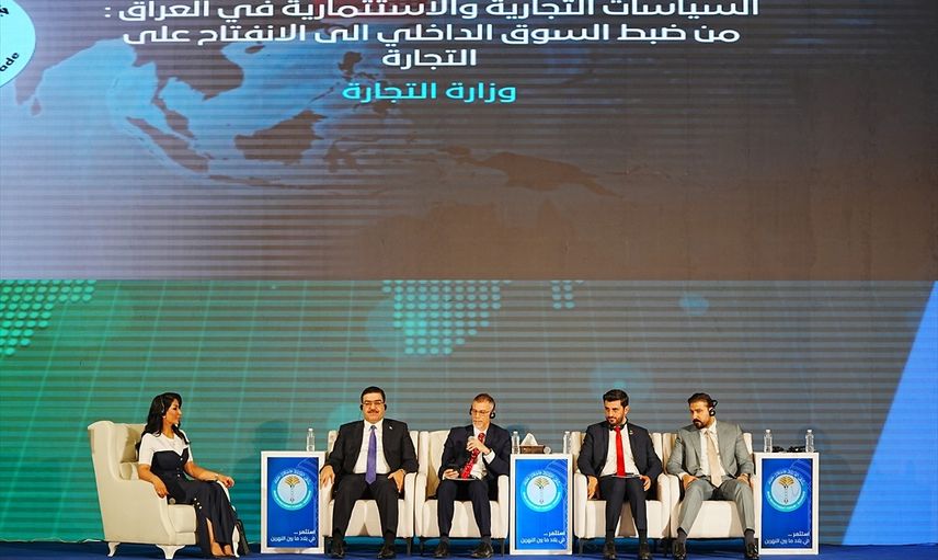 Irak Ticaret Bakanı Etir Davud Selman el-Greyri (sağda), başkent Bağdat’ta düzenlenen bir yatırım panelinde konuşma yaptı.