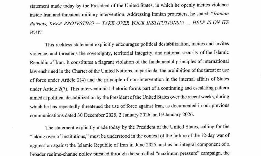 İravani mektubunda Trump'ın "İranlı vatanseverler protestolara devam edin. Kurumları ele geçirin. Yardım yolda" ifadelerine atıfta bulundu. Mektupta bu sözlerin "siyasi istikrarsızlığı açıkça teşvik ettiği, şiddeti kışkırttığı ve İran İslam Cumhuriyeti’nin egemenliğini, toprak bütünlüğünü ve ulusal güvenliğini tehdit ettiği" belirtildi. İravani ayrıca bu tür açıklamaların BM Şartı’ndaki uluslararası hukukun temel ilkelerini ihlal ettiğini savundu.
