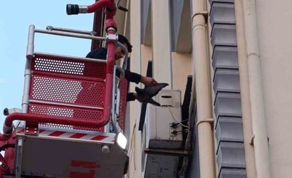 HATAY’DA KLİMA MOTORUNUN KABLOSUNA DOLAŞARAK MAHSUR KALAN KEDİYİ İTFAİYE KURTARDI.