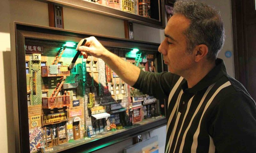 "Bu sanat, diorama olarak biliniyor. Diorama, minyatür sanatıdır. Bir olayı, bir durumu ya da bir sahneyi küçük figürler ve maketlerle canlandırarak anlatma tekniğidir. Bu sanat ilk olarak Uzak Doğu’da ortaya çıkmış, daha sonra tüm dünyaya yayıldı. Açıkçası bu işlerin buraya kadar ilerleyeceğini ben de beklemiyordum. Bir arkadaşımın yaptığı maketleri görüp ‘ben de yapabilirim’ diye düşünerek hobi olarak başladım. Küçük çalışmalarla adım attım ve yaklaşık 20 yıldır bu işle uğraşıyorum. İlk başlarda evde çalışıyordum, emekli olduktan sonra iş yerini açtım. Sabah geliyorum, bir bakıyorum akşam olmuş; zaman nasıl geçiyor anlamıyorum. Hobi olarak başladığım bu iş artık benim mesleğim oldu"