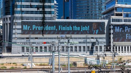 İsrail, ABD Başkanı Trump'a yöneltilen 'Bay Başkan, işi bitir' pankartıyla İran'a yönelik saldırı talebini vurguladı.