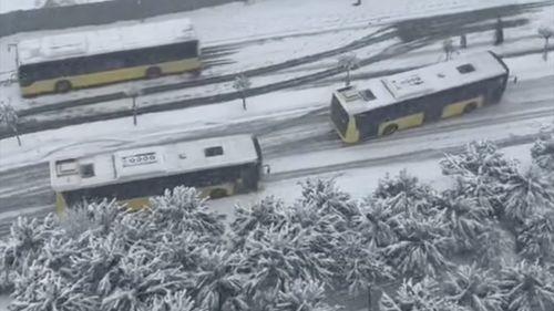 İstanbul'da kar yağışı ulaşımı olumsuz etkilerken, cesur bir kişi Büyükçekmece'de denize girdi.