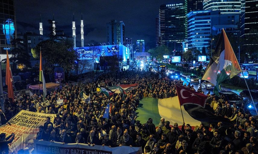 Katılımcılar, pankartlarında "Özgür Filistin", "Bu son gece, şimdi değil de ne zaman?" ve "Hamas eğilmez Gazze yenilmez" yazılarına yer verdi. Grup, "Katil İsrail hesap verecek", "Filistin halkı yalnız değildir" ve "İstanbul'dan Hamas'a, direnişe bin selam" sloganlarını attı. Protestoya katılanlardan birinin üzerinde "Özgürlük Filosu onurumuzdur" yazılı bir gemi maketi taşıdığı görüldü.