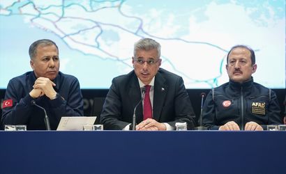 Sağlık Bakanı Kemal Memişoğlu (ortada), İçişleri Bakanı Ali Yerlikaya (solda) ile birlikte İstanbul İl Afet ve Acil Durum Müdürlüğü'nde düzenlenen toplantının ardından basın mensuplarına açıklamalarda bulundu.