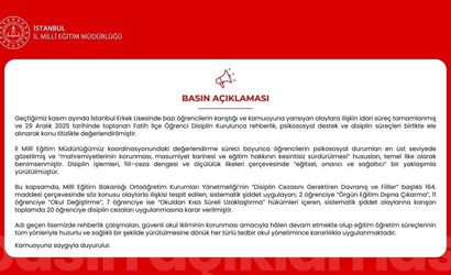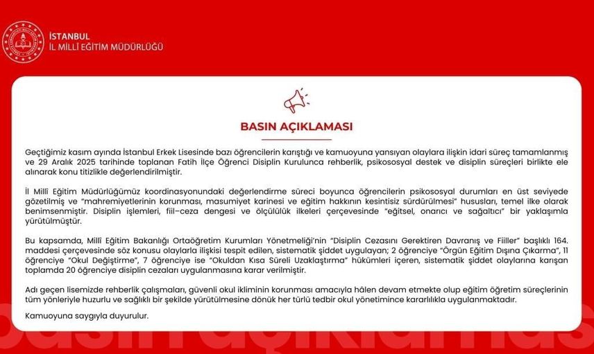 Açıklamada, 29 Aralık 2025 tarihinde toplanan Fatih İlçe Öğrenci Disiplin Kurulu kararının; rehberlik, psikososyal destek ve disiplin süreçleri birlikte ele alınarak konunun titizlikle değerlendirildiği belirtilerek, sürecin Milli Eğitim Müdürlüğü koordinasyonunda yürütüldüğü vurgulandı.
