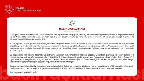 İstanbul Erkek Lisesi'nde 20 öğrenciye disiplin cezası Soruşturma tamamlandı, cezalar açıklandı İstanbul İl Milli Eğitim Müdürlüğü, 25 Kasım 2025 tarihinde İstanbul Erkek Lisesi erkek pansiyonunda yaşandığı iddia edilen kavga ile ilgili başlatılan idari soruşturmanın tamamlandığını duyurdu. Açıklamada, 29 Aralık 2025…