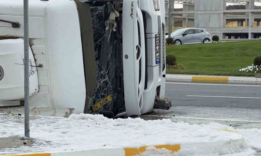 İstanbul Havalimanı yolunda, bağlantı kavşağına giren bir hafriyat kamyonu kontrolden çıkarak yan yattı. Olay, kargo terminali girişi bağlantı kavşağında meydana geldi.