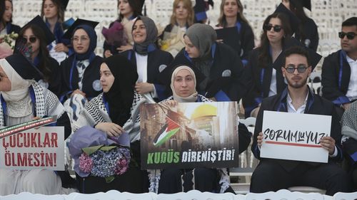 İstanbul Medipol Üniversitesi mezunları, tören sırasında Filistin ve Gazze'ye destek mesajı verdi.