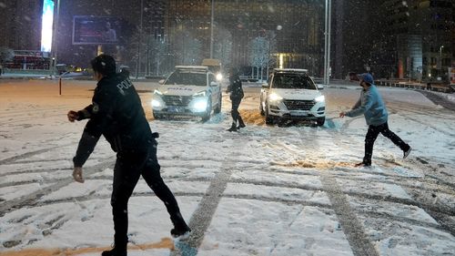 Taksim'de polis memurları ve vatandaşlar, kar yağışı altında keyifli anlar geçirerek kar topu oynadı.