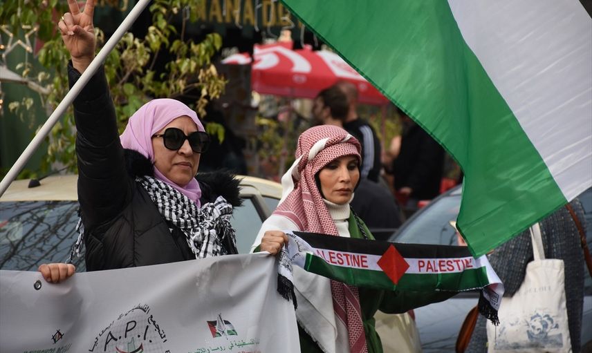 Göstericiler, İsrail'in Gazze'ye yönelik saldırılarına da sert tepki gösterdi. "Özgür Filistin" ve "Faşist, terörist İsrail" sloganlarını atan kalabalık, protestoları esnasında yoğun bir coşku sergiledi.
